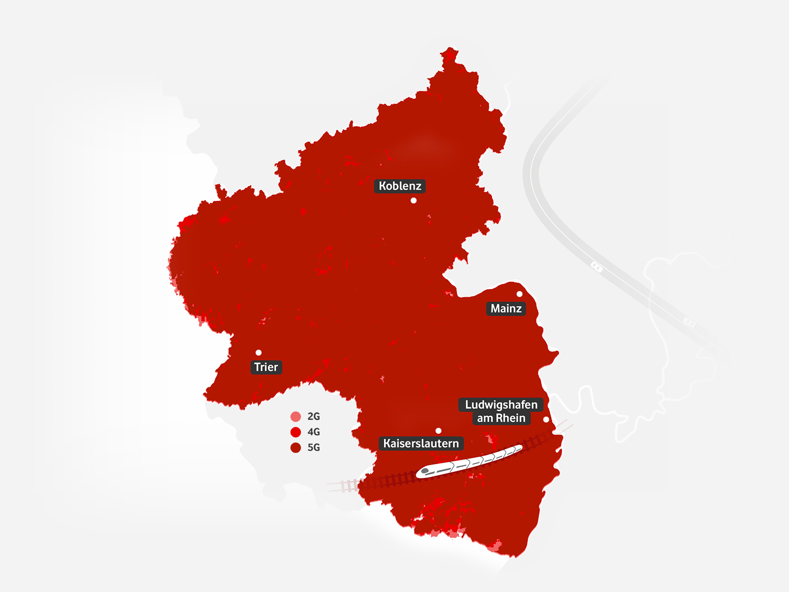 98,37 % aller Haushalte in Rheinland-Pfalz sind mit dem schnellen Breitband-Internet via LTE oder 5G versorgt. 98,8 % ihrer Zeit bewegen sich Vodafone-Kunden im schnellen LTE- oder 5G-Netz.