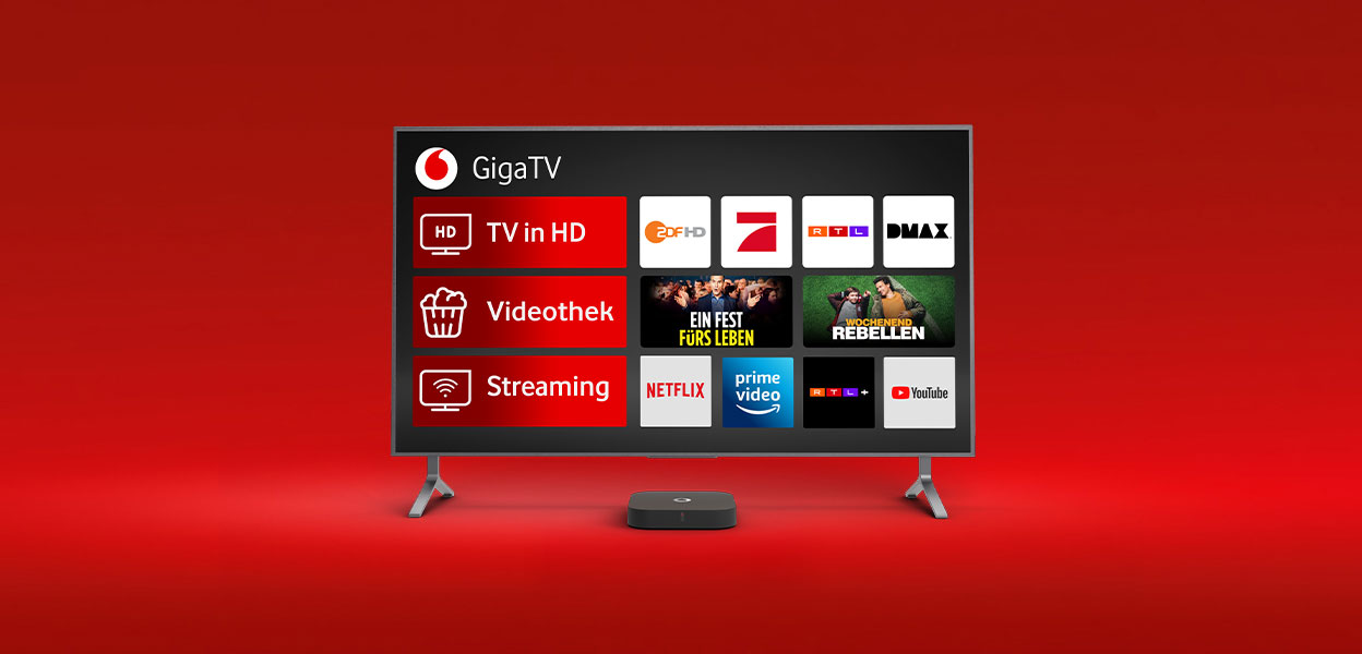 Alle TV Optionen nutzt Du mit Deiner GigaTV Box und Deinem Fernseher. Vodafone Premium (Plus) und die internationalen TV-Pakete nutzt Du außerdem mit der GigaTV-App oder der GigaTV Mobile-App.