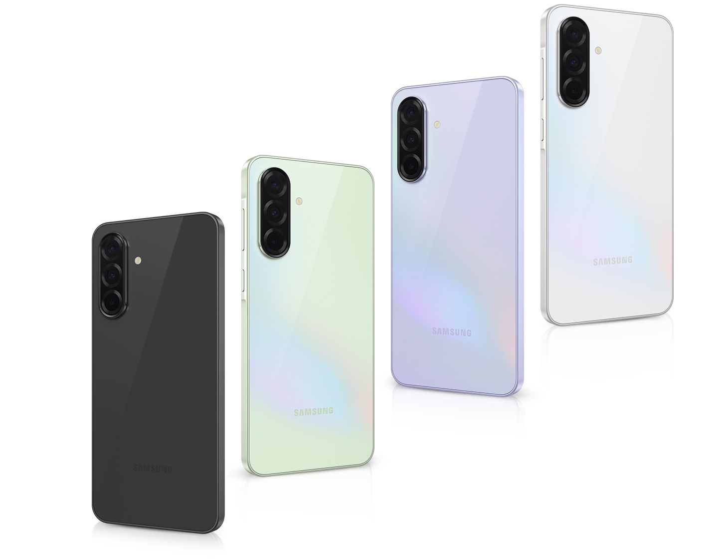 Vier Galaxy A36 5G Geräte in Rückansicht, jeweils in verschiedene Richtungen geneigt. Das Gerät ganz links und das zweite von rechts sind nach rechts geneigt, während das Gerät ganz rechts und das zweite von links nach links geneigt sind.