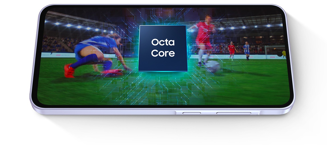 Ein Galaxy A36 5G horizontal platziert. Auf dem Bildschirm läuft ein Fußballspiel. Darüber ist der Octa-Core-Prozessor zu sehen.