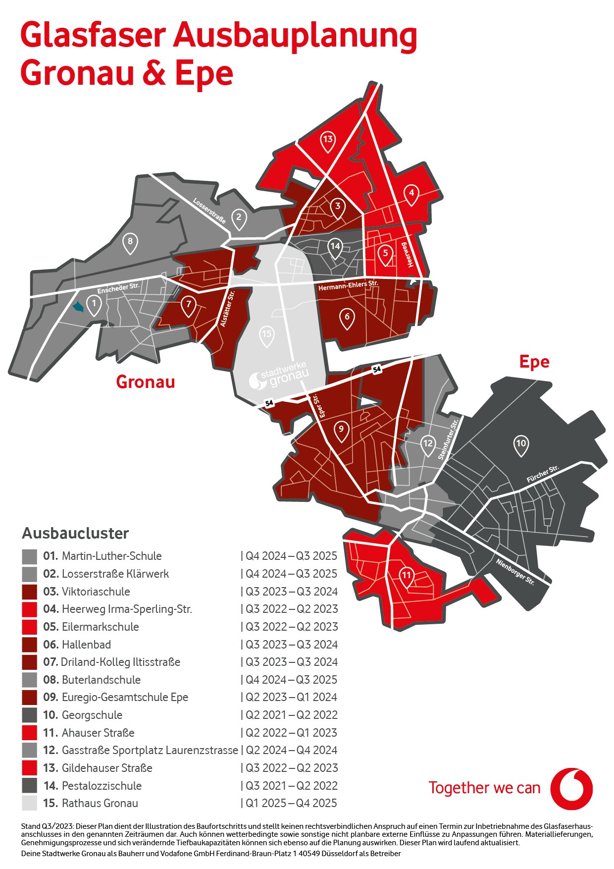 Die Frist für die Vorvermarktung in Gronau ist Ende Dezember 2023 ausgelaufen. Die Stadtwerke Gronau sind aktuell im Bau und in der Planung der weiteren noch nicht erschlossenen Stadtteile. Vodafone hat in den Gebieten um die Georgschule und Pestalozzischule mit den Anschaltungen begonnen.